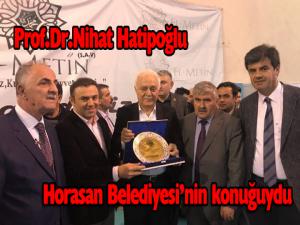 Horasanda olmaktan mutlu olduğunu ifade eden Prof. Dr Nihat Hatipoğlu, "Horasanın güzel ilçemizin saygı değer misafirleri, saygı değer kaymakamımız belediye başkanımız, başkan yardımcıları ve ilçemizin değerli sakinleri öncelikle sizleri selamların en şereflisi ve en güzeli olan yüce Allahın selamı ile selamlıyorum. Allahın selamı, rahmeti, mağfireti, hidayeti hepinizin üzerine olsun. Hepiniz hoş geldiniz, onurlar verdiniz. Sevgiliyi anlatmak için yollara düştük. Yani Hazreti Peygamber muhabbeti, sevgili dostlar bir avcı gibi, peygamber muhabbetine koşan bir ceylan gibi bizde arkasından koşan bir avcı gibi sürekli onu aradık. Sürekli ona vurgun bir hayat yaşadık. Muhabbetin ve aşkın merkezi. Bu insanları buraya getiren şey, yeryüzünün en şevkli insanı, dünyamızın ve ahretimizin ebedi önderi olan sevgili Peygamberimiz Hz. Muhammed (s.a.v) sevgisidir diye konuştu.