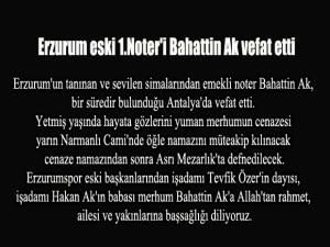 Erzurum'un tanınan ve sevilen simalarından emekli noter Bahattin Ak, bir süredir bulunduğu Antalya'da vefat etti. Yetmiş yaşında hayata gözlerini yuman merhumun cenazesi yarın Narmanlı Cami'nde öğle namazını müteakip kılınacak cenaze namazından sonra Asrı Mezarlık'ta defnedilecek.