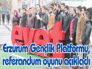 Erzurum'da faaliyet gösteren 14 gençlik sivil toplum kuruluşunun bir çatı altında toplandığı Erzurum Gençlik Platformu (EGP), önümüzdeki 16 Nisan tarihinde yapılacak olan halkoylaması nedeniyle basın açıklaması yaptı. EGP Başkanı Mustafa Kahveci'nin yaptığı açıklamada, "Erzurum Gençlik Platformu olarak, bayrağımıza, vatanımıza, devletimize ve milletimize sahip çıkmak için 'Evet' diyoruz." dedi.