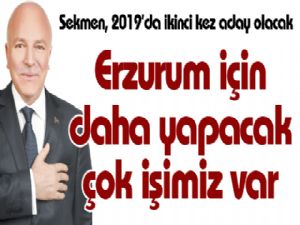 Kamuoyunda, "Sekmen yeniden aday olmaz, olsa bile milletvekili adayı olur" şeklindeki değerlendirmelere karşın Başkan Sekmen, geçen hafta Ritim FM'de Orhan Bozkurt'un sunduğu "Erzurum Ajans" programında 2019'da yapılacak yerel seçimlerde aday olacağını söyledi. Sekmen, "Erzurum için daha yapacak çok işimiz var. Erzurum'u dünya ölçeğinde bir şehir yapana kadar yola devam edeceğiz" dedi.