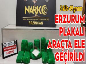 Erzincan Emniyet Müdürlüğü, Narkotik Suçlarla Mücadele Şube Müdürlüğü ekiplerince Erzincan-Erzurum karayolu üzerinde risk analizine dayalı yapılan yol uygulamasında; saat 23.15 sıralarında şüphe üzerine durdurulan 25 plakalı araçta yapılan kontrollerde, aracın ön tamponuna zulalanmış vaziyette 10 paket halinde toplam ağırlığı 5 kg 49 gram metamfetamin maddesi ele geçirildi.