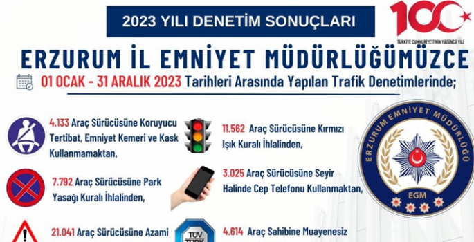 1 Ocak - 31 Aralık 2023 tarihleri arasında yapılan bir yıllık denetim ve çalışmalarda; Erzurum’da 4 bin 133 araç sürücüsüne koruyucu tertibat, emniyet kemeri ve kask kullanmamaktan, 7 bin 792 araç sürücüsüne park yasağı kuralı ihlalinden, 21 bin 41 araç sürücüsüne azami hız limitlerini aşmaktan, 519 araç sürücüsüne alkollü olarak araç kullanmaktan, 389 araç sürücüsüne yayalara ilk geçiş hakkını vermemekten, 11 bin 562 araç sürücüsüne kırmızı ışık kuralı ihlalinden, 3 bin 25 araç sürücüsüne seyir halinde cep telefonu kullanmaktan, 6 bin 614 araç sahibine muayenesiz aracı trafiğe çıkartmaktan, 699 araç sürücüsüne tehlikeli şerit ihlalinden ve bin 99 araç sürücüsüne sürücü belgesiz olarak motorlu araç kullanmaktan ceza yazıldı.