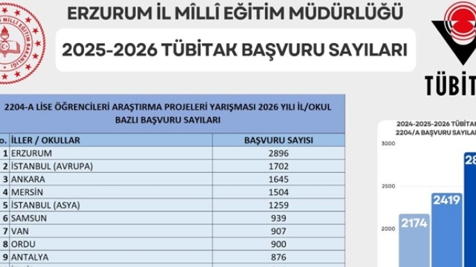 Açıklanan verilere göre Erzurum, 2 bin 896 proje başvurusu ile Türkiye genelinde birinci sırada yer alarak önemli bir başarıya imza attı.