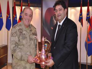 Ziyaretin anısına Erzurum Ticaret Borsası Yönetim Kurulu Başkanı Hakan Oral, Tümgeneral Ahmet Hacıoğluna, üzerinde Erzurum Ticaret Borsası yazılı Bakır işlemeli ibrik hediye etti. (iha)