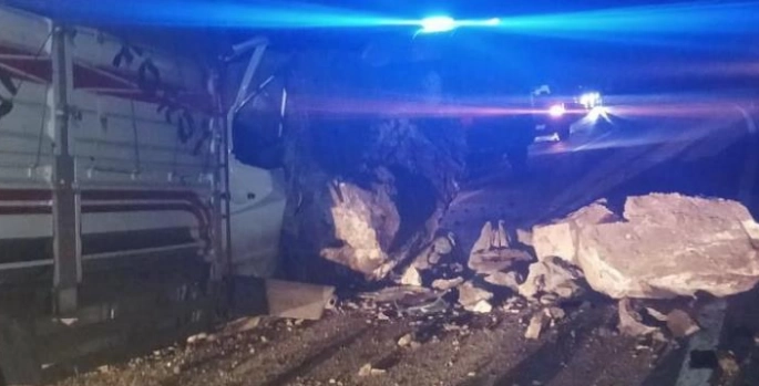 Erzurum’un Hınıs ilçesinde yola düşen dev kaya parçası iki araca çarptı. Araçlarda bulunan 2 kişi yaralandı.