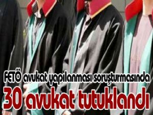 FETÖ avukat yapılanmasına ilişkin soruşturmada gözaltına alınan 38 avukattan 30'u tutuklandı. Şüphelilerin avukatlık mesleğini yapıyor görünümü altında FETÖ yapılanmasının amaçlarını gerçekleştirmek için eylem ve işlemlerde bulundukları, örgütün amaç ve stratejisi doğrultusunda algı oluşturmaya çalıştıkları belirtildi.