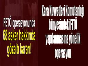 Alınan bilgiye göre, Ankara Cumhuriyet Başsavcılığı'nca Kara Kuvvetleri Komutanlığı bünyesindeki asker şahıslardan FETÖ' nün mahrem imamlar ile örgüt mensubu askerler arasında iletişim yöntemi olarak kullandığı, kontörlü telefonlar ile ankesörlü, büfe telefonlarından periyodik ve ardışık arama sistemiyle haberleştikleri ve FETÖ terör örgütü ile irtibatları tespit edilen haklarında bu soruşturma nedeniyle kısa süre önce idari işlem yapılan 22 albay; halen aktif görevde 19 Yarbay; haklarında bu soruşturma nedeniyle kısa süre önce idari işlem yapılan 27 yarbay olmak üzere toplam 68 asker şahıs hakkında 02.07.2018 tarihinden itibaren gözaltı kararı verildi. Gözaltı işlemlerinin Ankara Emniyet Müdürlüğü Terörle Mücadele Şube Müdürlüğünce Ankara ve 18 ilde devam ettiği bildirildi. (iha)