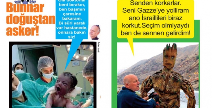 Bir başka sayfasında da dergide, Erzurum Büyükşehir Belediye Başkanının ürkütücü bir robotu İsrailliler korksun diye Gazze’ye yollaması, mizahi bir dille işlendi.