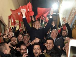 En yakın rakibiyle arasındaki farkın açılmasının ardından ilk olarak araçlarla konvoy yapan partililer daha sonra AK Parti İl Başkanlığı önünde buluştu. Ellerindeki meşaleleri yakan partililer çalan davul-zurna eşliğinde halay çekerken, partililer omuzlarına aldıkları Belediye Başkanı Ercan Çimen'e sevgi gösterisinde bulundu.