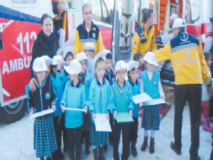 İnönü İlköğretim Okulu toplantı salonunda teorik bilgiler verildikten sonra, öğrenciler salon dışına alınarak 112 ambülansların içine girdiler ve görevlilerden bilgiler aldılar.