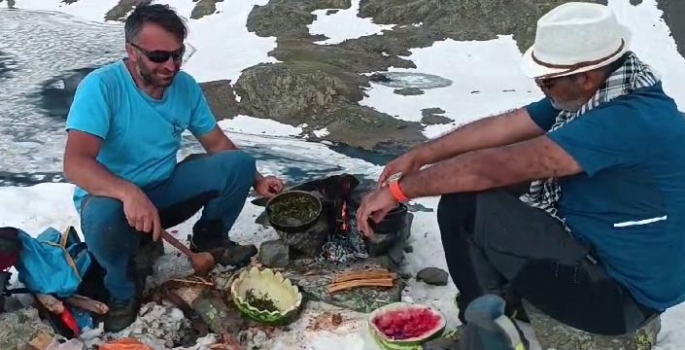 Erzurum'un İspir ilçesinde yaşayan Bülent Erkan, Haziran ayında kar üzerinde yemek keyfi yaşadı.