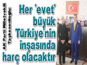 Nisan ayında yapılması planlanan anayasa değişikliği referandumunda toplumun kahır ekseriyetinin evet diyeceğini savunan AK Parti Erzurum Milletvekili Zehra Taşkesenoğlu, "Yeni ve büyük Türkiye'nin inşası için, inanıyorum ki aklıselim herkes bu referandumda tercihini 'evet'ten yana kullanacaktır" dedi.