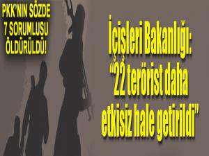 Buna göre, son bir haftada gerçekleştirilen iç güvenlik operasyonlarında 10u ölü olmak üzere 22 terörist etkisiz hale getirildi. Teröristlerden 7sinin sözde üst düzey olduğu kaydedildi.