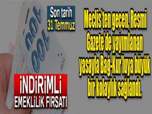 Son olarak 2011de bu yönde bir düzenleme yapılmıştı. O nedenle borçlu Bağ-Kurlular bu fırsatı değerlendirmeli. Üstelik nakdi olmayanlar için ucuz kredi imkanı da sağlanacak. Mevcut durumda bu imkân var. Martta Ziraat Bankası ile SGK arasında bir protokol imzalanmıştı. Buna göre; hemen emekli olabilecek Bağ-Kurlu yüzde 1.28 faiz oranı ve 48 ay vadeyle kredi çekebiliyor. Sürenin uzatılması için çalışma yürütülüyor.