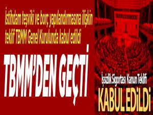 İşsizlik Sigortası Kanunu ile Bazı Kanunlarda Değişiklik Yapılması Hakkında Kanun Teklifi TBMM Genel Kurulu'nda kabul edildi. Teklifle, vergi borçları yapılandırılarak 18 taksitle ödenebilecek. Gelir Vergisi, Kurumlar Vergisi, Katma Değer Vergisi (KDV), Motorlu Taşıtlar Vergisi (MTV), Özel Tüketim Vergisi (ÖTV), tüm idari para cezaları, KYK borçları, Hazine alacaklarını kapsayan vergi borçları yapılandırılabilecek.