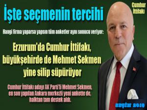 Ankara merkezli bir araştırma şirketi tarafından, üç il bazında yapılan seçim anketinde, Erzurum'da yine rekor düzeyde AK Parti önde çıktı. Başta Haberlercom sitesi olmak üzere, bir çok mecrada yayımlanan söz konusu ankette, seçmenin yüzde 72.4ü Cumhur İttifakı adayı AK Parti'li Mehmet Sekmen'i, yüzde 15.1'i İP' adayı Mahmut Uykusuz'u, yüzde 8'i de CHP adayı Mehmet Şimşek'i tercih etti.