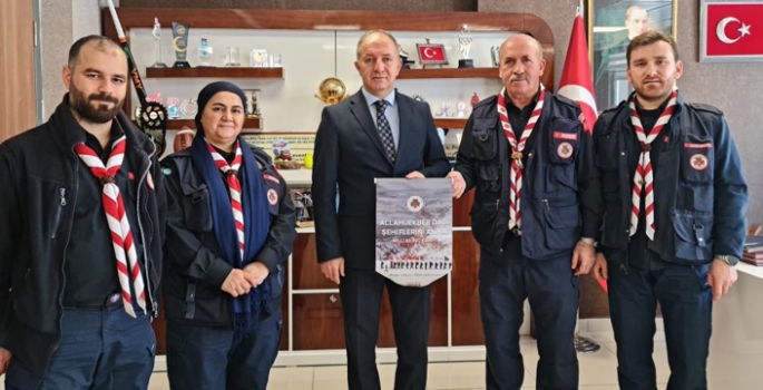 İzcilik Federasyonu Erzurum İl Temsilcisi Nuri Karslı, Gençlik ve Spor İl Müdürü Levent Çakmur’a federasyonun daha önceki senelerde Allahu Ekber Şehitlerine yaptıkları yürüyüşün simgesini taşıyan flamayı hediye etti.