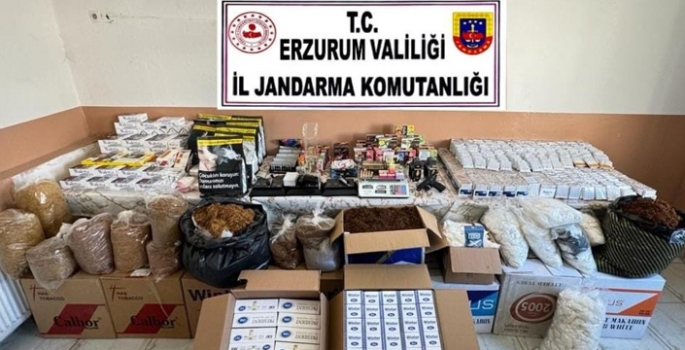 Erzurum İl Jandarma Komutanlığı ekipleri tarafından kaçakçılık ile mücadele kapsamında; Oltu ilçesinde yapılan arama faaliyeti sonucu, 1 adet ruhsatsız tabanca,1 adet elektronik sigara dolum makinası, 1 adet terazi, 2 adet manuel yaylı sistem sigara dolum makinası, 50 adet küçük sigara doldurma aparatı, 100 bin adet içi tütünle doldurulmuş makaron, 250 bin adet boş makaron, 50 kg. nargile tütünü, 500 adet likit filtre, 150 kg. kıyılmış tütün, 100 adet kesilmiş bandrol, 80 adet puro, 50 bin adet filtre, 20 bin adet sigara paketlemede kullanılan poşet ele geçirildi.