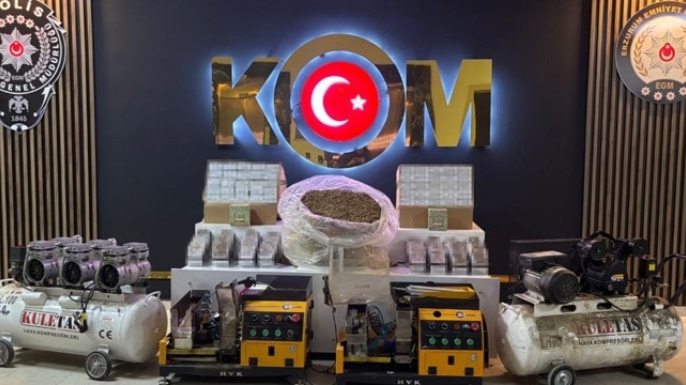 Tortum Cumhuriyet Başsavcılığı koordinesinde Kaçakçılık ve Organize Suçlarla Mücadele Şube Müdürlüğünce, 5607 sayılı Kaçakçılıkla Mücadele Kanunu kapsamında Tortum İlçesinde bir iş yeri ve sigara imalathanesine dönüştürülmüş depo görünümlü yerde yapılan çalışmada; 2 adet otomatik sigara doldurma makinesi, 2 adet kompresör, 5 bin adet doldurulmuş makaron, bin 584 adet gümrük kaçağı sigara sarma kağıdı, 33 bin 800 adet boş makaron, 10 kg açık kıyılmış tütün ve bin 500 adet şeffaf sigara poşeti ele geçirildi.