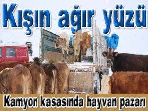 Oltu ilçesinde tüccarlar, her hafta sonu cumartesi günleri kurulan canlı hayvan pazarında kar ve soğuk hava yüzünden kamyon kasasında hayvanları satmaya çalışıyor.