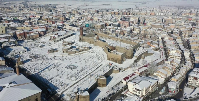 Aralıklarla devam eden kar yağışının ardından Yakutiye ilçesinde bulunan Erzurum Kalesi, Çifte Minareler gibi tarihi mekanlarda kartpostallık görüntüler oluştu.