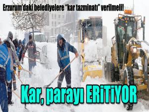 Erzurumda kış mevsimi belediyelerin bütçesini sarsıyor. Başta Büyükşehir Belediyesi olmak üzere, ilçe belediyeleri karla mücadeleye ciddi kaynak ayırıyorlar. Büyükşehir Belediyesi karla mücadeleye 200 milyon gibi bir kaynak aktarırken, diğer ilçe belediyeleriyle birlikte bu kaynak 250 milyon lirayı buluyor. Kış turizminin önemli merkezlerinden olan Erzurumda her yağan kar, turizmcileri sevince boğarken, belediyeleri de kara kara düşündürüyor.