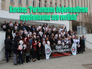 Karataş tarafından yapılan açıklamada, İş barışına halel getiren, vicdanları yaralayan, adalet duygusunu örseleyen mülakatla sözleşmeli öğretmen atama uygulamasına yönelik eleştirilerimizi dile getirmek; bazısı ölümle sonuçlanan şiddet olaylarını protesto etmek amacıyla bir araya gelmiş bulunmaktayız. Ekim 2017 tarihli Kurum İdari Kurulu Çalışma Raporunda pilot illerde uygulaması denenmeye başlanılan, öğretmen motivasyonunu olumsuz etkileyecek, çalışma barışını bozacak, kanuni dayanağı olmayan öğretmenlerin performans değerlendirmesi uygulamasına son verilmesi konusu üzerinde çalışma yapılması imza altında alınmasına rağmen böyle bir taslağın hazırlanması, söz konusu çalışmanın yapılmadığını, Bakanlığın, attığı imzanın gereğini yerine getirmekten imtina ettiğini göstermektedir diye konuştu.
