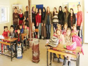 Bu arada okulun girişine asılan içiçe el resmi olan bir pano asan Yrd. Doç. Dr. Sibel Açışlı, "Bu panoda içiçe el resmi ile yaprakları olmayan bir ağaç resmi var. Bu çalışmada her dönem gittiğimiz okulda onarım ve tadilat çalışmalarına bizzat katılan okulun yenilenmesinde emeği geçen herkes parmağını bir boyaya batırarak parmak izini bırakıyor. Bizler de bunu okula asaraktan bir hatıra bırakıyoruz" dedi.