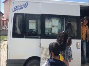 Erzurumun Horasan ilçesi Kurtuluş İmam Hatip Orta Okulunda taşımalı eğitim gören öğrenciler karne heyecanını öğrenci servisinin camlarına karnelerini yapıştırarak gösterdiler.