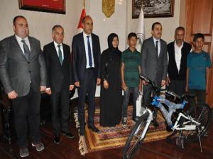 Valilik makamında Karadağ ailesini ağırlayan Vali Öksüz, Liselere Giriş Sınavı'nda 500 tam puan alarak Türkiye birincileri arasında yer alan Adil Karadağ'a altın ve kitap seti, 470 puan alan kardeşi Yusuf Karadağ'a da bisiklet hediye etti.