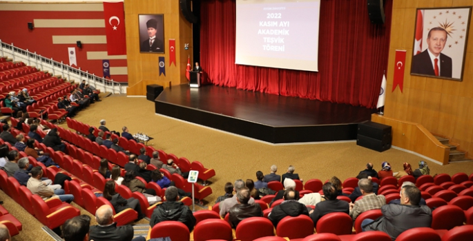 Kültür Merkezi 15 Temmuz Milli İrade Salonunda çalışmalarıyla ön plana çıkan akademisyenlere ödüllerini takdim eden Rektör Çomaklı, araştırma temelli yaptıkları çalışmalarından ve başarılarından dolayı akademisyenleri tebrik etti.