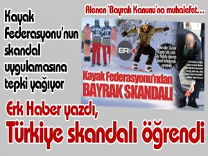 Erzurumda 19-21 Ocak tarihleri arasında gerçekleştirilen Snowboard Boardercross Dünya Şampiyonasında Türkiye Kayak Federasyonu, büyük bir skandala imza attı. Federasyon, Snowboard Cross Milli Takımı sporcularının, yarışlarda üzeri Ay Yıldızlı Türk bayrağıyla süslenmiş snowboard tahtası yarıştırdığı ortaya çıktı. Cumhurbaşkanı Recep Tayyip Erdoğanın dünya liderler zirvesinde yerdeki Türk bayrağını alıp, öperek cebine koyup, bayrak hassasiyetini ortaya koyduğu bir ortamda, Kayak Federasyonunun Ay Yıldızı sporcularının ayaklarının altına aldırması tepkilere neden oldu! Başta Cumhurbaşkanlığı olmak üzere Spor Bakanlığı ve Spor Genel Müdürlüğünün Türk bayrağına aleni saygısızlık yapan ve yapılmasına göz yuman Kayak Federasyonu Başkanı Erol Yarar ve yönetim kurulu hakkında nasıl bir yaptırım uygulayacağı şimdiden merak konusu oldu