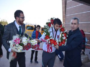 Milli sporcu ve aynı zamanda Türkiye adına çeyrek finale kadar yükselme başarısı gösteren, Antrenör Emre Şahin ile birlikte Erzurum Havalimanı'na uçakla iniş yapan dünya üçüncüsü Cebrail Gençoğlu coşkulu bir şekilde karşılandı.