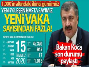 Türkiye'de son 24 saatte 947 kişiye korona virüs tanısı konuldu. Bin 13 kişi iyileşirken, 17 kişi virüs nedeniyle hayatını kaybetti. Sağlık Bakanı Fahrettin Koca, Yeni iyileşen hasta sayımız, yeni vaka sayısından fazla mesajını paylaştı.