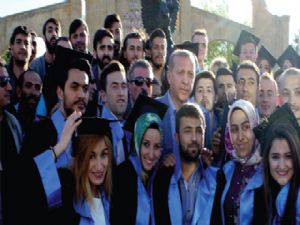 Cumhurbaşkanı Erdoğan, İstasyon Meydanı'ndaki halka hitabının ardından Cumhurbaşkanlığı otobüsüyle şehir turu attı. Erdoğan, bu sırada Atatürk Üniversitesi girişinde bulunan çift başlı kartal anıtı önünde mezuniyet fotoğrafı çektiren öğrenci grubunu görünce otobüsten inerek öğrencilerin yanına gitti. Atatürk Üniversitesi İletişim Fakültesi Gazetecilik Bölümü son sınıf öğrencileri, mezuniyet hatırası olarak cübbe ve kepleriyle fotoğraf çektirmek istedikleri Cumhurbaşkanı Erdoğan'dan iş için yardım talebinde bulundular. İletişim Fakültesi'nden mezun olan birçok öğrencinin okul bittikten sonra işsizler kervanına katıldıklarını belirten öğrenciler, medya okur yazarlığı dersine dikkat çektiler. İleride işsiz kalmamak için bu dersin önemli olduğunu ifade eden öğrenciler, Cumhurbaşkanı Erdoğan'dan bu konunun üzerinde durmasını istediler. Öğrencileri dinleyen ve birlikte hatıra fotoğrafı çektiren Cumhurbaşkanı Erdoğan, "Tamam bu hususu dikkate alacağım. BİMER'e bu konuyla ilgili mesaj atın ve Büyükşehir Belediye Başkanı Mehmet Sekmen ile de görüşün"dedi.