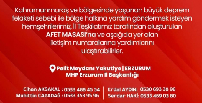 Deprem bölgesine yardım göndermek isteyen hemşerilerimiz, İl Teşkilatımız tarafından oluşturulan afet masasına ve aşağıda yer alan iletişim numaralarına yardımlarını ulaştırabilirler. Tüm hemşehrilerimizi bu kampanyaya katılmaya davet ediyoruz." Dedi.