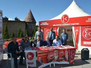 Yakutiye Kent Meydanının Cumhuriyet Caddesi tarafında konuşlandırılan çadırdaki stantta MHPnin seçim beyannamesi, vaatleri ve çalışmaları seçmenlere anlatılıyor, tanıtım broşürleri vasıtasıyla da yazılı olarak takdim ediliyor.