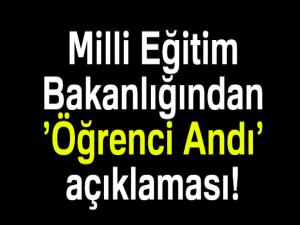 Milli Eğitim Bakanlığından yapılan açıklamada, medyaya Öğrenci Andı Geri Dönüyor başlığıyla yansıyan haberlerle ilgili yapılmasına gerek duyulduğu belirtilerek, "İlköğretim kurumlarında Öğrenci Andı' okutulmasına ilişkin yönetmelik maddesi, 8 Ekim 2013 tarihli Milli Eğitim Bakanlığı İlköğretim Kurumları Yönetmeliğinde Değişiklik Yapılmasına Dair Yönetmelik'in 1. Maddesiyle yürürlükten kaldırılmıştır. Danıştay 8. Dairesi, 24.04.2018 tarihinde söz konusu yönetmelik hükmünün iptaline, ilk derece mahkemesi olarak temyiz yolu açık olmak üzere karar vermiştir. Söz konusu karar henüz kesinleşmemiştir. Hukuki süreç devam etmektedir" denildi. (iha)