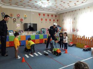 Miniklerin dikkatini çekmek için işe önce telsizle konuşturarak başlayan ekipler, daha sonra yaya geçitinden nasıl geçilir, trafik ışıklarını, araçta çocuklar hangi koltuklarda oturabilir ve hatta hız yapan sürücüleri uyarma gibi konuları anlattılar.