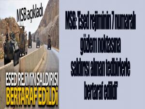 Milli Savunma Bakanlığının resmi sosyal medya hesabından yapılan paylaşımda, İdlib'de 7 numaralı gözlem noktasına saldırıda bulunan Esed rejim güçlerinin alınan tedbirler sonrasında bertaraf edildiği belirtildi. Yapılan paylaşımda, "İdlib gerginliği azaltma bölgesindeki 3,4,5,6,7,8 ve 9 numaralı gözlem noktalarımıza Esed rejimi tarafından yönlendirilen sivil görünümlü bazı gruplar yaklaşmış, 7 numaralı gözlem noktamıza saldırıda bulunmuş, alınan tedbirler sonrasında dağılmışlardır" denildi.(iha)