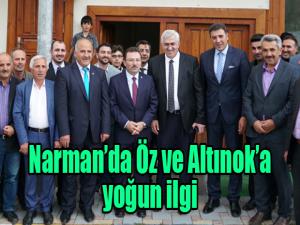 AK Parti Erzurum İl Başkanı Mehmet Emin Öz ile AK Parti Erzurum Milletvekili Adayı Selami Altınok Narmanda yoğun ilgi gördü. Milletvekili Adayı Altınokun dünyaya geldiği Beyler Mahallesinde adeta bir sevgi seliyle karşılaşan Öz ve Altınok, ilçe merkezinde kurulan halk pazarını ziyaret edip, esnafa bol ve bereketli kazançlar temennisinde bulundu.