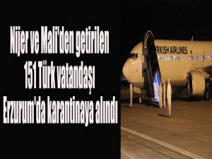 Türk Hava Yolları (THY), korona virüs salgını nedeniyle dünyanın farklı ülkelerinde mahsur kalan Türk vatandaşlarını intikal uçuşlarıyla ülkeye getirmeye devam ediyor. Bu kapsamda Nijer ve Mali'de bulunan 151 Türk vatandaşı, yeni tip korana virüs salgını önlemleri kapsamında uçakla Erzurum'a getirildi. Erzurum Havalimanı'nda uçaktan inen vatandaşların pasaport ve sağlık kontrolleri yapıldıktan sonra çanta ve valizleri dezenfekte edildi.
