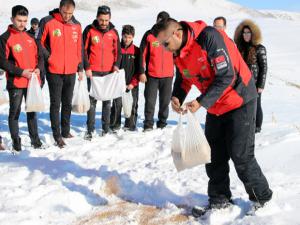 Erzurum Macera Off Road Doğa Sporları Kulubü Başkanı Lokman Toptaş, yaptığı açıklamada, ekip olarak düzenledikleri gezintide, kırsal kesimlerde kar yağışından dolayı aç kalan yaban hayvanlarına yem bıraktıklarını söyledi.