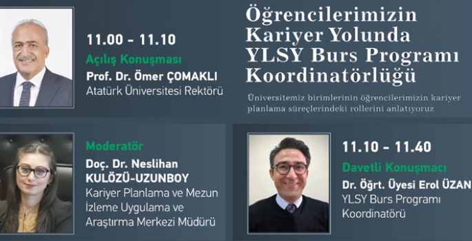 Öğrencilerin kariyerlerini şekillendirmeleri ve kendilerine en uygun yolu seçebilmelerine katkı sunmak amacıyla söyleşi programları düzenleyen Atatürk Üniversitesi Kariyer Planlama Mezun İzleme Uygulama ve Araştırma Merkezi (ATA KARMER) tarafından bu hafta, Yurt Dışına Lisansüstü Öğrenim Görmek Üzere Gönderecek Öğrencileri Seçme ve Yerleştirme (YLSY) Burs Programı Koordinatörlüğü ele alındı.
