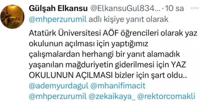 Bunun üzerine Yurdagül, Atatürk Üniversitesi Rektörü Prof. Dr. Ömer Çomaklı ile konu hakkında yaptığı görüşmeyi yayınladı. Öğrencilerin taleplerine sessiz kalmayarak, ilgili mercilere ilettiğini ve konunun olumlu sonuçlanması için çaba sarfettiğini yazan Adem Yurdagül, gençlerin büyük beğenisini aldı.