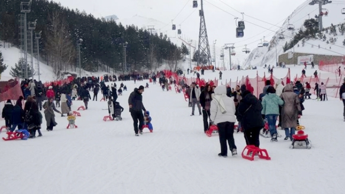 Kar kalınlığının 2 metreyi aştığı Palandöken'de farklı kentlerden gelerek yarıyıl tatilini geçiren kayak severler karın ve kayağın keyfini doyasıya yaşıyorlar. Dünyanın en uzun kayak pistlerine sahip olan merkezde aileler ve çocuklar kızak keyfi yaparken, kayak severler ise pistlerde kayak keyfi yapmaya devam ettiler.