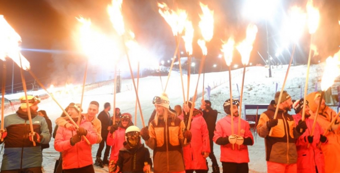 Kış turizminin gözde mekanlarından Erzurum Palandöken'e gelen tatilciler, yeni yıla meşaleli kayak gösterisiyle girdi.