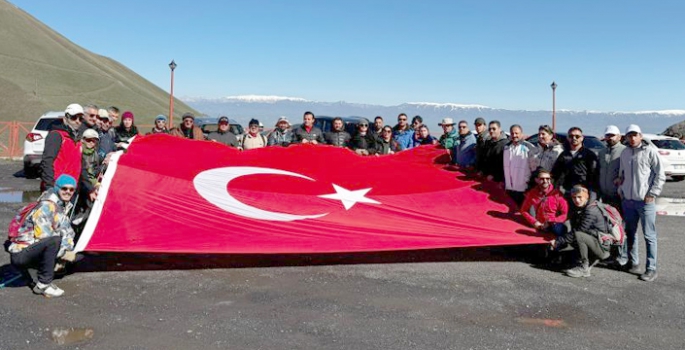 Yaklaşık 50 dağcının katıldığı yürüyüşün ardından zirvede saygı duruşunda bulunan katılımcılar İstiklal Marşı’nı okuduktan sonra inişe geçti.