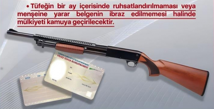 Yapılan açıklamada, “Yivsiz tüfek ruhsatnamesi geçerlilik süresi dolan vatandaşlarımızın 01.09.2023 tarihine kadar ruhsatnamelerini yeniletmeleri gerekmekte olup yeniletmeyen kişilerin ruhsatnameleri 01.09.2023 tarihinden sonra geçersiz sayılacak ve ilgililer hakkında 2521 sayılı Kanun'un 13. maddesi kapsamında işlem uygulanacaktır.” denildi.