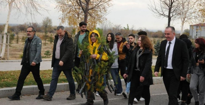 Erzincan’da sarı renkli yağmurluk üzerine vücudunun tamamına çam fidanlarını asıp cadde ve sokakları yürüyen profesörün halini görenler gözlerine inanamadı.